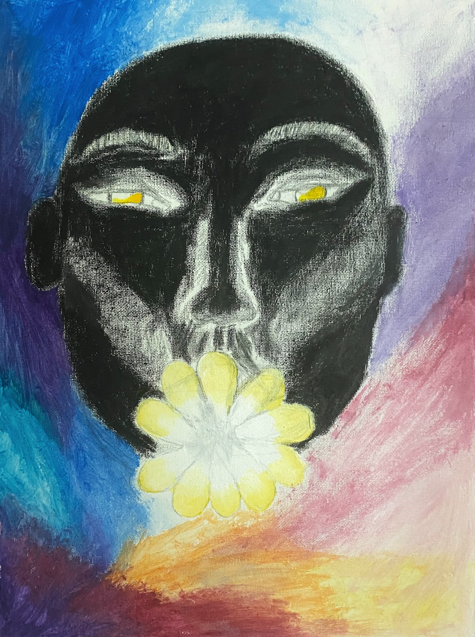The goal was to recreate an abstract self portrait I painted (see pictured below). Even though it seemed easy enough at first, this process was much more complex than I anticipated. I attempted this project by breaking the image into different geometric components, programming shapes in relation to one another-- which inevitably incorporated geometry. This face part of the design is static, but the background colors animate according to the mouseX and mouseY positions.